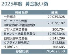 ガーナ児童婚を終わらせる指定募金をはじめ、一般募金、ガザ人道緊急募金、ミャンマー地震緊急募金、自然災害緊急募金と多くの募金に取り組んでいただいたほか、当協会の主催する事業にご協賛・ご協力をいただくなど、多大なご支援をいただきました。